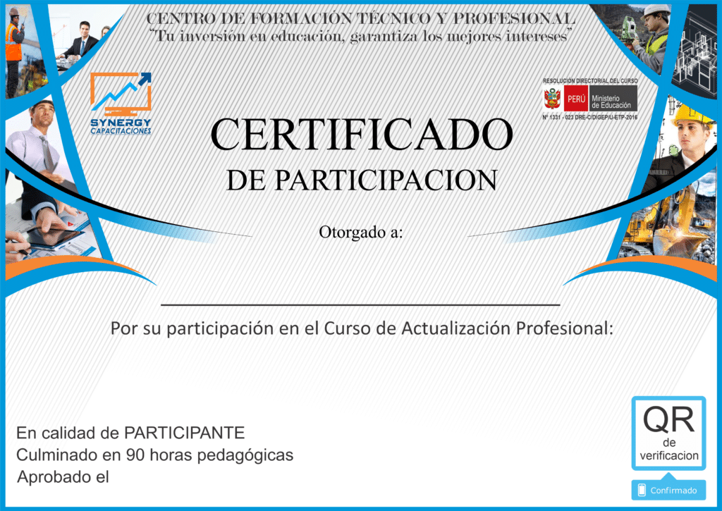 Recibirás una certificación oficial de la empresa respaldada por resolución directoral por tu participación. Es un documento profesional con el que podrás demostrar tus conocimientos y fortalecer tu perfil laboral para participar en licitaciones publicas y privadas.